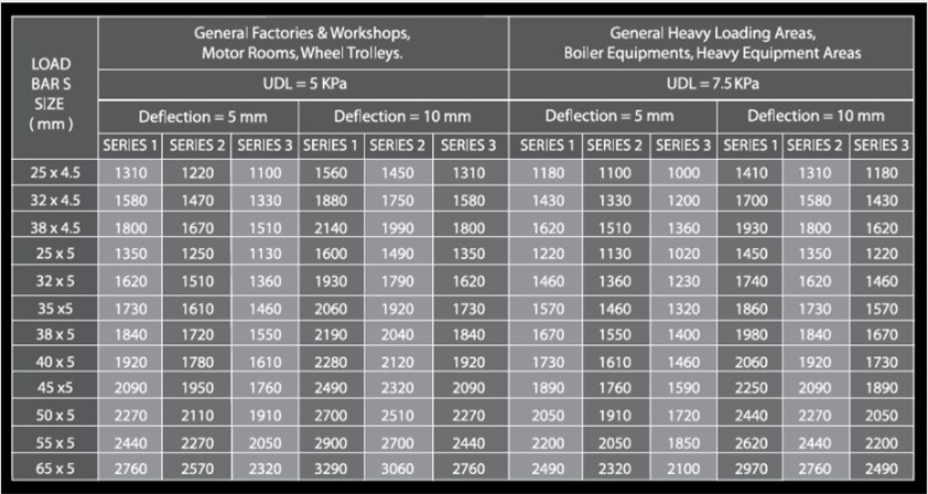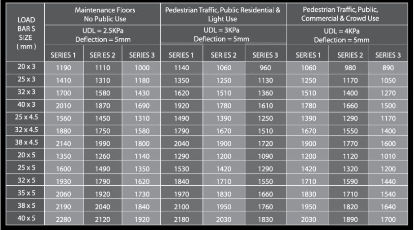 Maximum recommended spans in millimeter